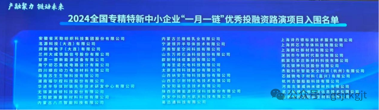 近日,“一月一鏈” 中小企業(yè)融資促進(jìn)全國(guó)行上海站活動(dòng)開(kāi)啟。全國(guó) 6 家專(zhuān)精特新中小企業(yè)在活動(dòng)中進(jìn)行了項(xiàng)目路演推介,其中甘肅股權(quán)交易中心“專(zhuān)精特新專(zhuān)板”掛牌企業(yè)蘭州大成鐵路信號(hào)股份有限公司和甘肅一德新能源設(shè)備有限公司成功入圍 2024 年全國(guó)專(zhuān)精特新中小企業(yè) “一月一鏈” 優(yōu)秀投融資路演項(xiàng)目。